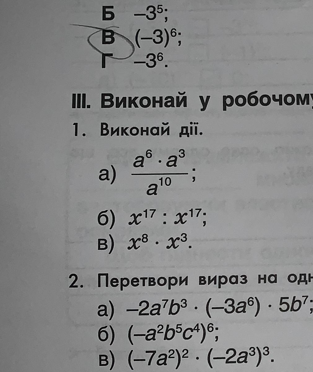 а) а^6×а^3/а^10=а^9/а^10(скорочуємо)=1/а