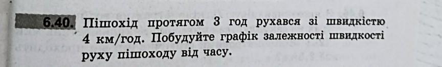 На графіку ось x представляє час в годинах, а ось y представляє швидкість в кілометрах на годину. Так як швидкість пішоходу залишалася сталою і дорівнювала 4 км/год протягом 3 год, графік буде показувати пряму лінію, паралельну вісі x на рівні 4 км/год протягом перших 3 годин.