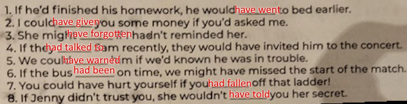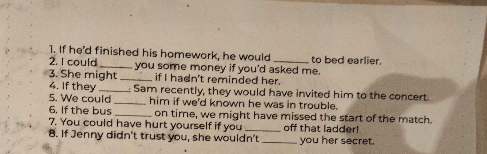 1. If he'd finished his homework, he would 2. I could 3. She might 4. If they 5. We could 6. If the bus 7. You could have hurt yourself if you 8. If Jenny didn't trust you, she wouldn't to bed earlier. you some money if you'd asked me. if I hadn't reminded her. Sam recently, they would have invited him to the concert. him if we'd known he was in trouble. on time, we might have missed the start of off that ladder! you her secret. the match.