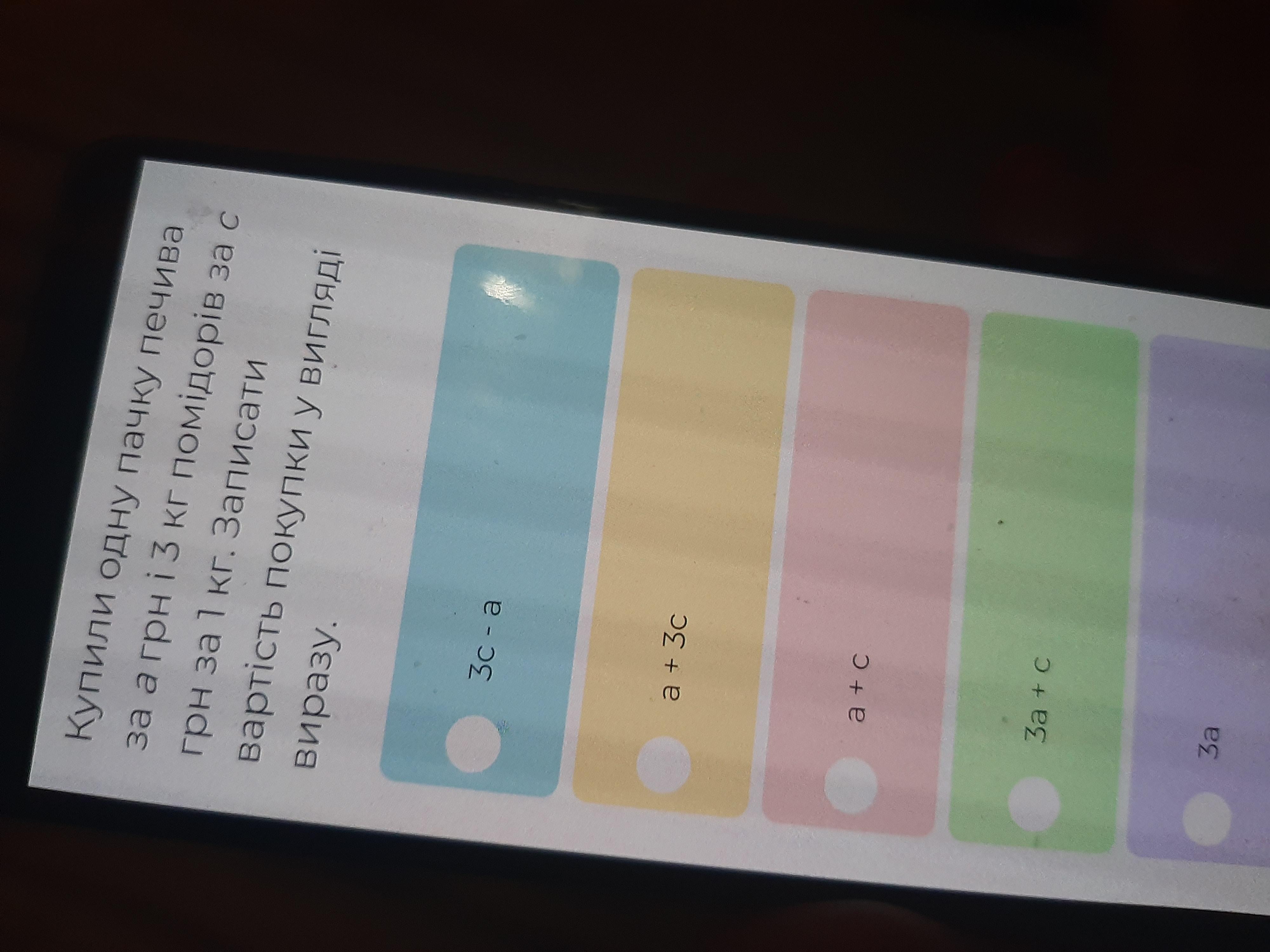 Купили одну пачку печива за a грн і 3 кг помідорів за c гривень за 1 кг. Записати вартість покупки у вигляді виразу