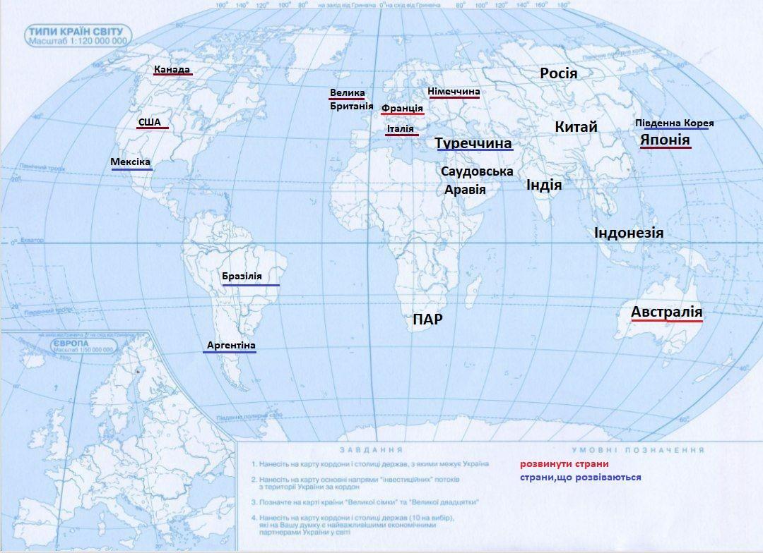 Розвинені країни-це — США, Японія, Німеччина, Франція, Велика Британія, Італія, Канада та Австралія.(червоний кольор)