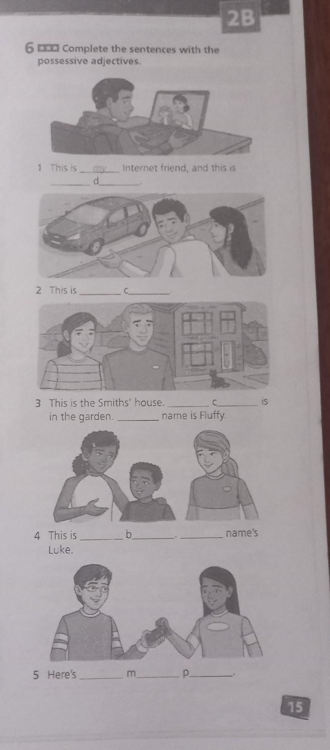 and 6 Complete the sentences with the possessive adjectives. 1 This is 2 This is 3 This is the Smiths' house. in the garden 4 This is my Internet friend, and this is d 2B b name is Fluffy name's IS