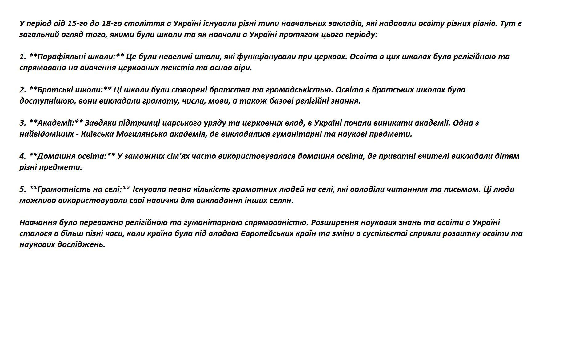 У період від 15-го до 18-го століття в Україні існували різні типи навчальних закладів, які надавали освіту різних рівнів. Тут є загальний огляд того, якими були школи та як навчали в Україні протягом цього періоду: