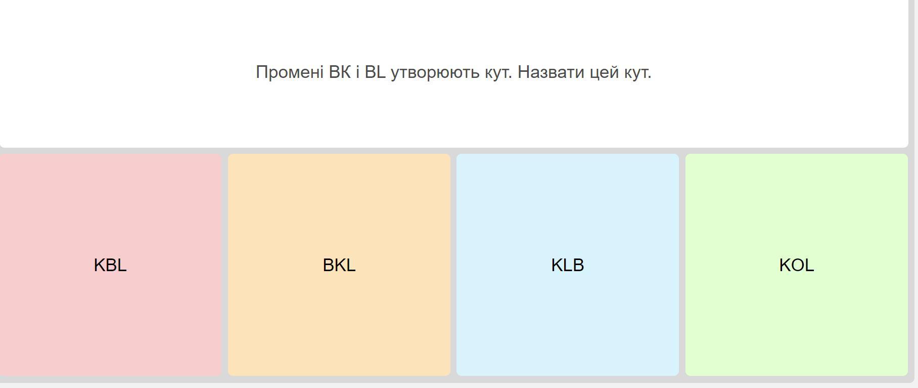пояснение Кут, який утворюється перетином прямих ліній BK та BL, називається "кут BKL" або "кут KBL." Кут BKL – це кут між лініями BK та BL у точці K.