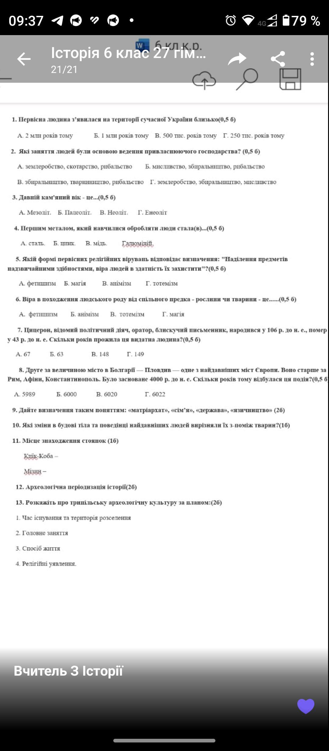 Відповідь: 1 Б, 2 Б, 3 Б, 4 В, 5 Б, 6 В, 7 Б, 8 А, 9 матріархат -це устрій де домінують жінки в сім'ї,державі, суспільстві. Сім'я - це первинний та основний осередок суспільства" держава- це політична форма організації правління" язичництво- це віра в багатьох богів. 10 вибачте, незнаю:_) 11. Киїк-коба Під карнизом високого плоскогір'я одного з відрогів Довгокорської яйли