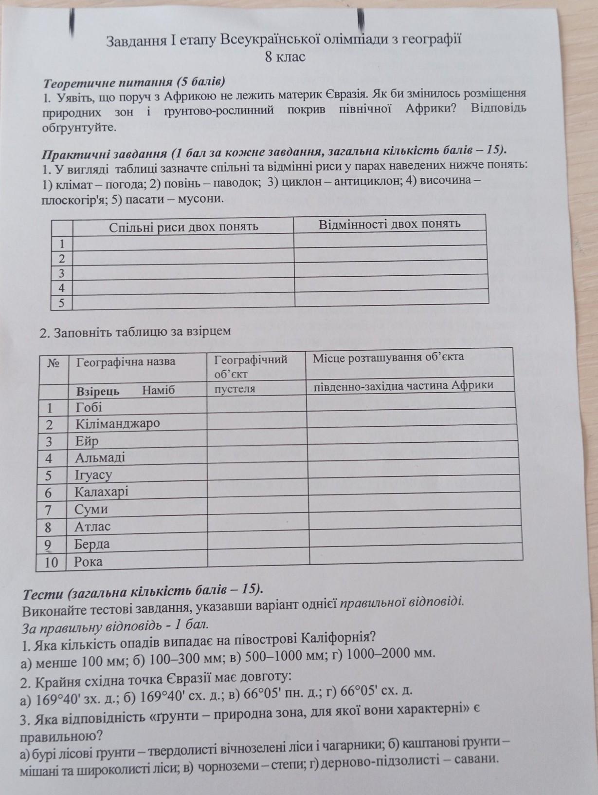 5 2. Заповніть таблицю за взірцем No Географічна назва Взірець Наміб Гобі 1 2 Кіліманджаро 3 4 5 6 7 8 9 Ейр Альмаді Iryacy Калахарі Суми Атлас Берда 10 Рока Географічний об'єкт пустеля Місце розташування об'єкта південно-західна частина Африки Тести (загальна кількість балів – 15). Виконайте тестові завдання, указавши варіант однієї правильної відповіді. За правильну відповідь - 1 бал. Яка кiлькiсть опадів випадає на півострові Каліфорнія?