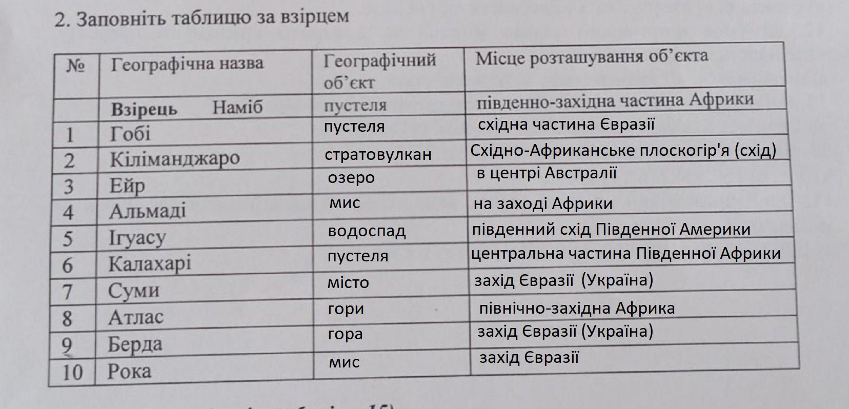 - Заповнена таблиця "Географічна назва Географічний об'скт Місце розташування об'єкта " дана нижче у додатку.