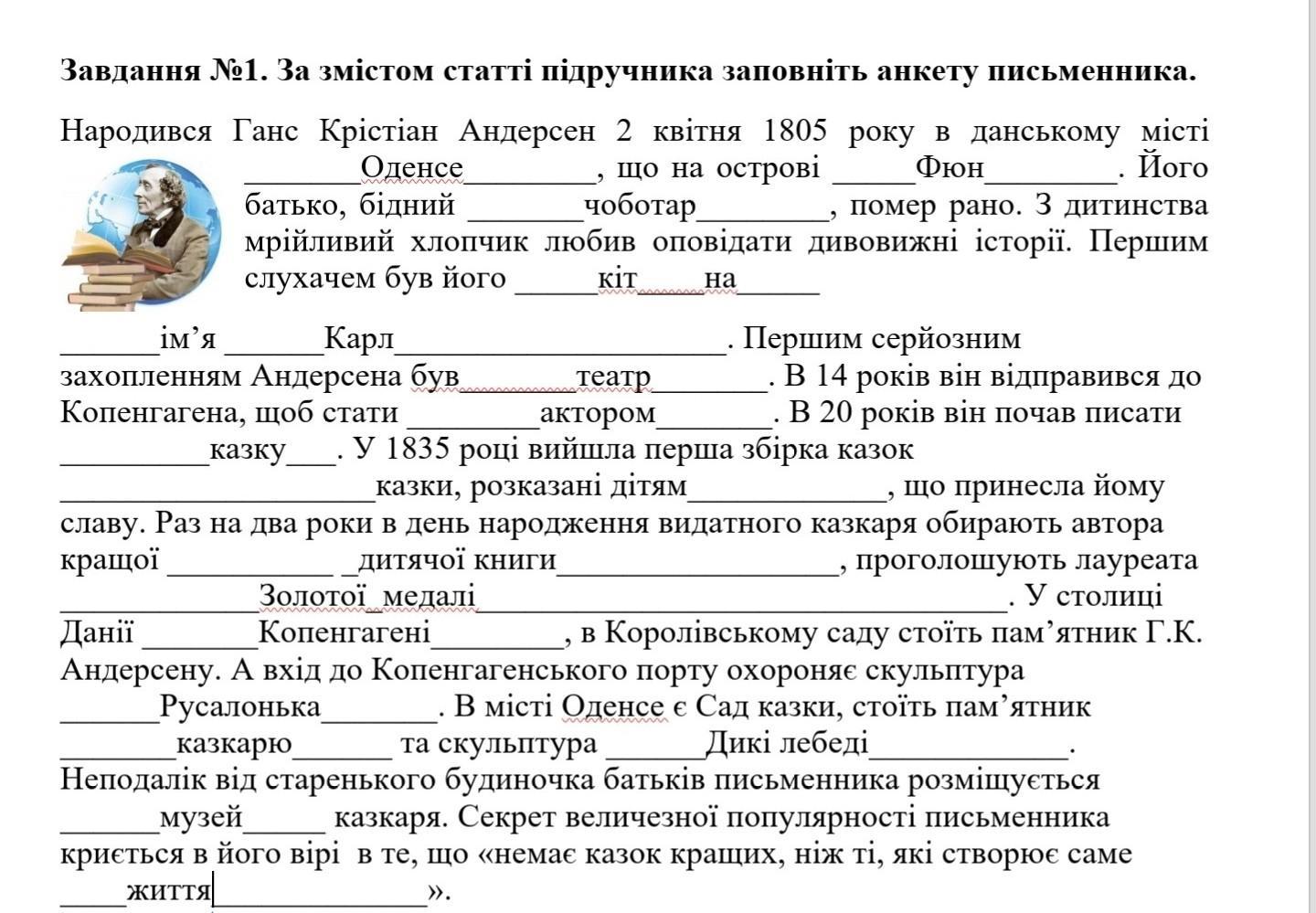 Народився Ганс Крістіан Андерсен 2 квітня 1805 року в данському місті 1 …, що на острові 2 …. Його батько, бідний 3…, помер рано. З дитинства мрійливий хлопчик любив оповідати дивовижні історії. Першим слухачем був його 4… . Першим серйозним захопленням Андерсена був 5… . В 14 років він відправився до Копенгагена, щоб стати 6… . В 20 років він почав писати 7… . У 1835 році вийшла перша збірка казок 8 …, що принесла йому славу. Раз на два роки в день народження видатного казкаря обирають автора кращої 9…, проголошують лауреата 10… . У столиці Данії 11… , в Королівському саду стоїть пам’ятник Г.К.Андерсену. А вхід до Копенгагенського порту охороняє скульптура 12… . Секрет величезної популярності письменника криється в його вірі в те, що «немає казок кращих, ніж ті, які створює саме 13…».