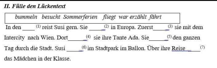 1. Sommerferien, 2. war, 3. fährt, 4. besucht, 5. bummeln, 6. fliegt, 7. erzählt