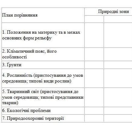 Цей план допоможе вам провести комплексне порівняння природних зон за різними аспектами і з'ясувати їхні основні відмінності та схожості.