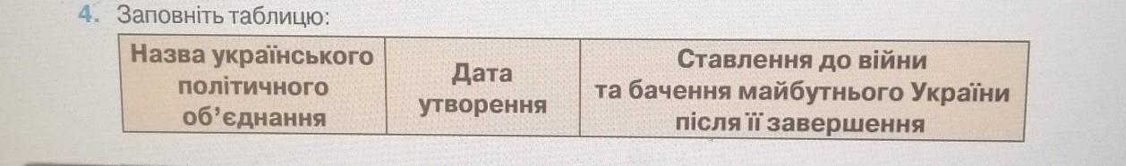ПОЖАЛУЙСТА ПОМОГИТЕ, ДАЮ СТО БАЛОВ 4. Заповніть таблицю: Назва українського політичного об'єднання,