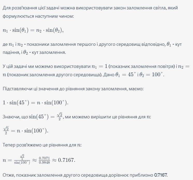 Промінь світла падає на межу двох середовищ. Кут падіння 45°, кут між