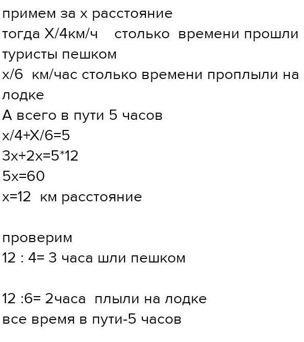 Туристы прошли некоторое расстояние со скоростью 4km/h. И такое же расстояние проплыли на лодке со скоростью 6km/h.на весь этот путь было потрачено 5h. Какой путь преодолели туристы пешком и на лодке.?