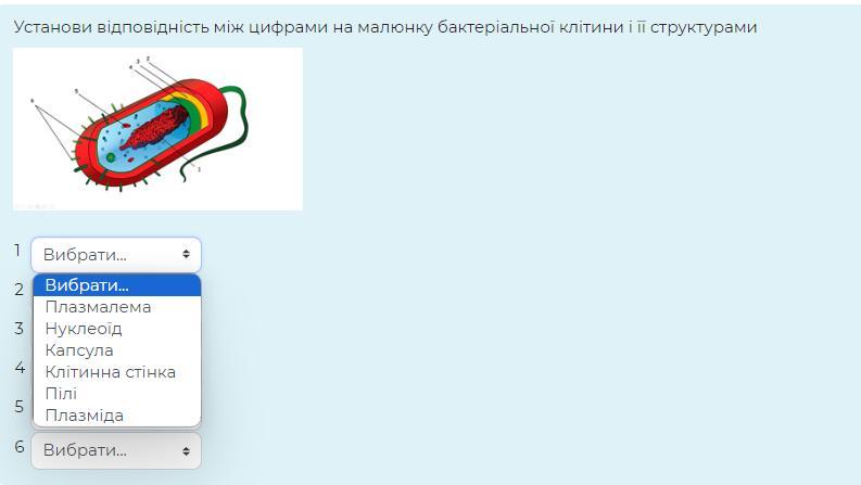 Установи відповідність між цифрами на малюнку бактеріальної клітини і її структурами