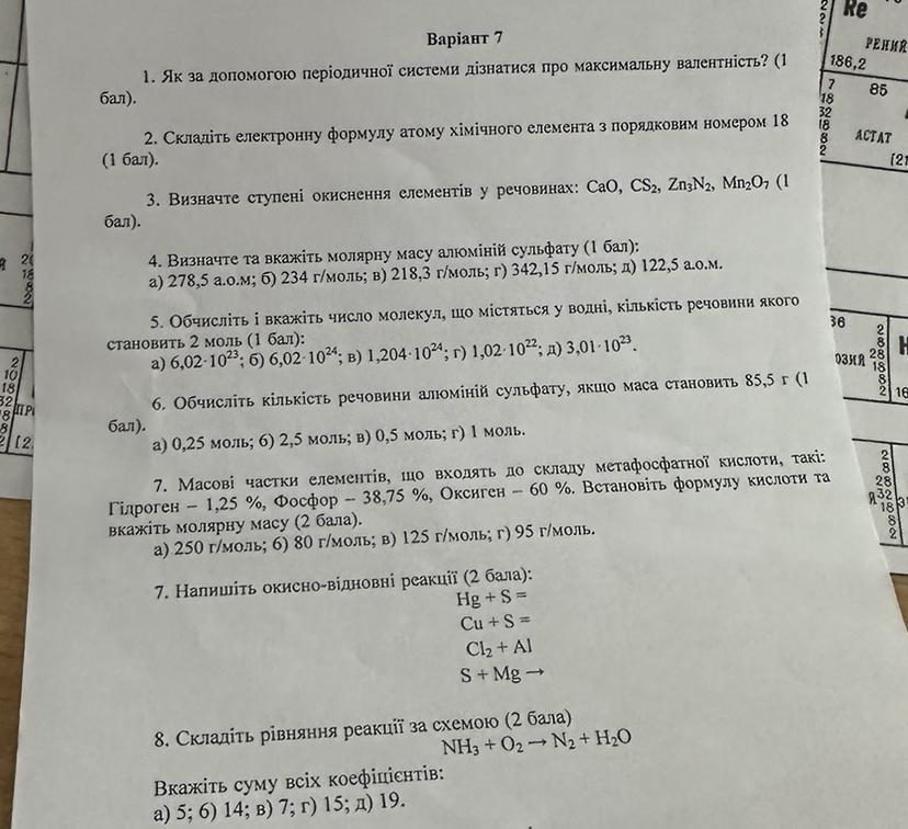 Ответ:Максимальне ступінь окиснення елементу можна визначити за допомогою періодичної системи. Він дорівнює номеру групи елементу. Для прикладу, елемент з порядковим номером 18 - аргон (Ar), і його максимальний ступінь окиснення дорівнює 0.Ступені окиснення елементів:CaO: Кальцій у +2, Оксиген у -2CS2: Вуглець у +4, Сірка у -2Zn3N2: Цинк у +2, Азот у -3Mn0: Марганець у 0 (елемент у вільному стані).Молярна маса алюміній сульфату (Al2(SO4)3) дорівнює приблизно 342,15 г/моль (г).Кількість молекул у 2 молях води дорівнює 1,204 × 10^24.Кількість речовини в алюміній сульфату масою 85,5 г дорівнює близько 0,5 моль.Формула метафосфатної кислоти (HPO3) з молярною масою приблизно 80 г/моль.Окисно-відновні реакції:Hg + S = HgSCu + S = CuS2Al + 3Cl2 = 2AlCl3S + Mg → MgSРівняння реакції: