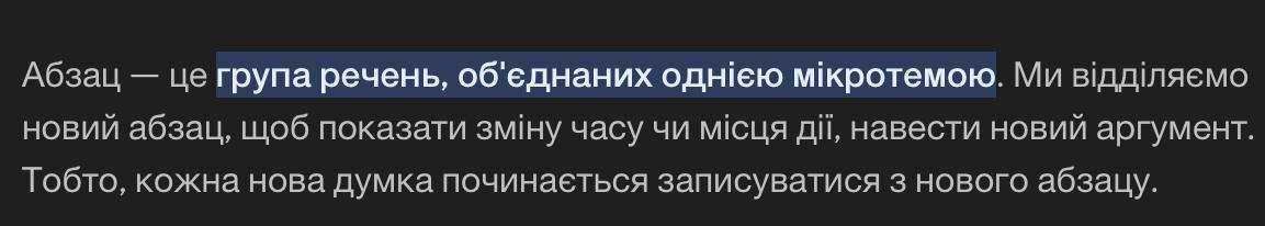 Абзац - це... А висловлення (письмове або усне), яке складається з кількох речень, об'єднаних спільним змістом і розташованих у потрібній для розкриття теми послідовності Б розкриття теми, те головне, що ми стверджуємо, доводимо те, про що розповідається Г частина тексту, об'єднана В А Б В Г Д мікротемою Д чітко сформульованi, пронумеровані й належним чином записані мікротеми