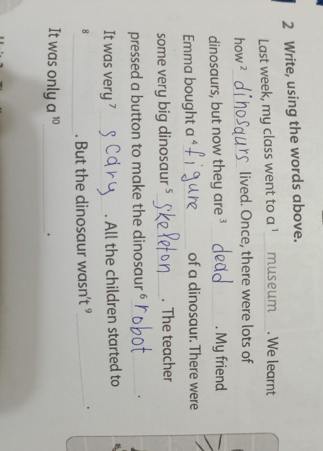 2 Write, using the words above. museum Last week, my class went to a ¹ We learnt how ² dinosaurs lived. Once, there were lots of 3 dinosaurs, but now they are dead . My friend 4 Emma bought a figure of a dinosaur. There were some very big dinosaurs skeleton The teacher pressed a button to make the dinosaur robot It was very' S Cary All the children started to 8 But the dinosaur wasn't 9 It was only a ¹0 6 •
