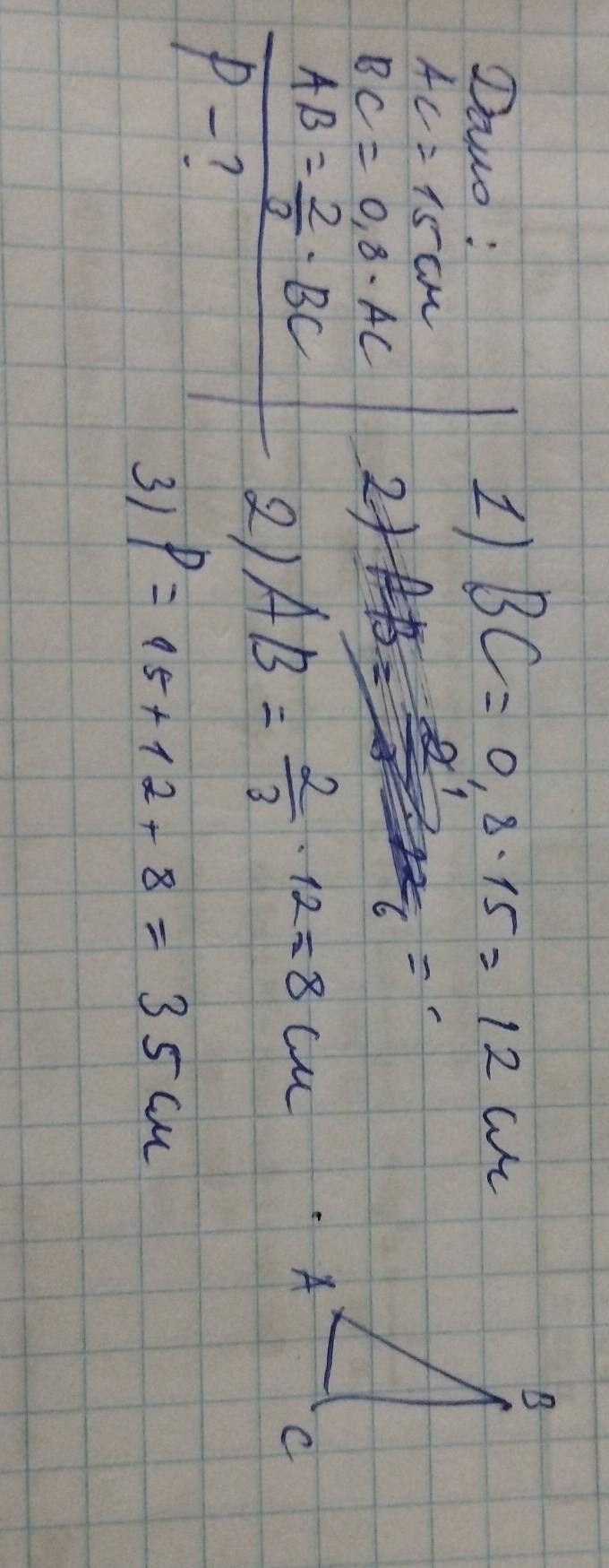 одна сторона трикутника дорівнює 15 см, друга становить 0,8 від першої, а третя - 2/3 від другої. Знайди периметр прямокутника