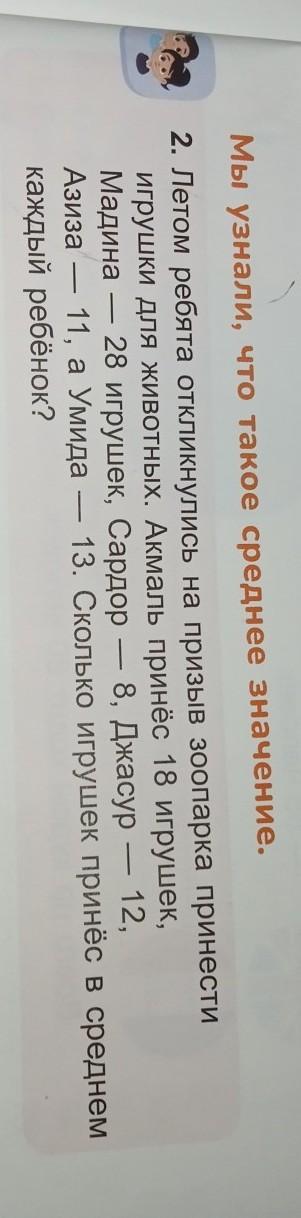 2. Летом ребята откликнулись на призыв зоопарка принести игрушки для животных. Акмаль принёс 18 игрушек, Мадина - 28 игрушек, Сардор - 8, Джасур - - 12, - - - Азиза - 11, а умида - 13. Сколько игрушек принёс в среднем - каждый ребёнок?