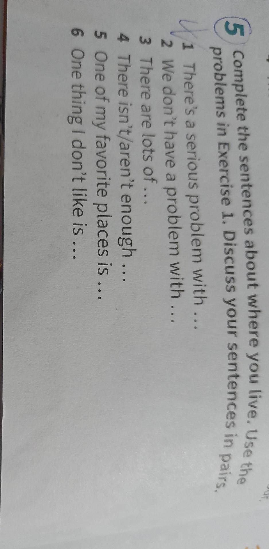 Complete the sentences about where you live.Use the problems in Exercise 1.Discuss your sentences in pairs.