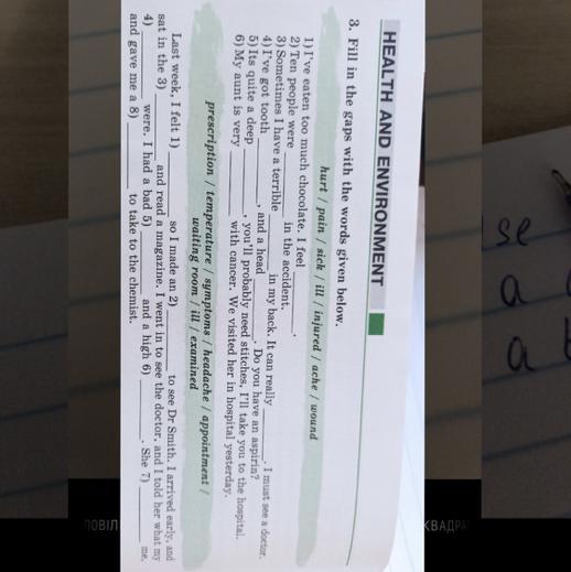 3) Fill in the gaps with the words given below. HEALTH AND ENVIRONMENT 6) My aunt is very 4) I've got tooth 5) Its quite a deep 3) Sometimes I have a terrible 1) I've eaten too much chocolate. I feel 2) Ten people were in the accident. prescription / temperature / symptoms / headache / appointment/ hurt/pain/sick/ill / injured / ache / wound in my back. It can really I must see a doctor. Do you have an aspirin? and a head waiting room/ill / examined you'll probably need stitches, I'll take you to the hospital. with cancer. We visited her in hospital yesterday.