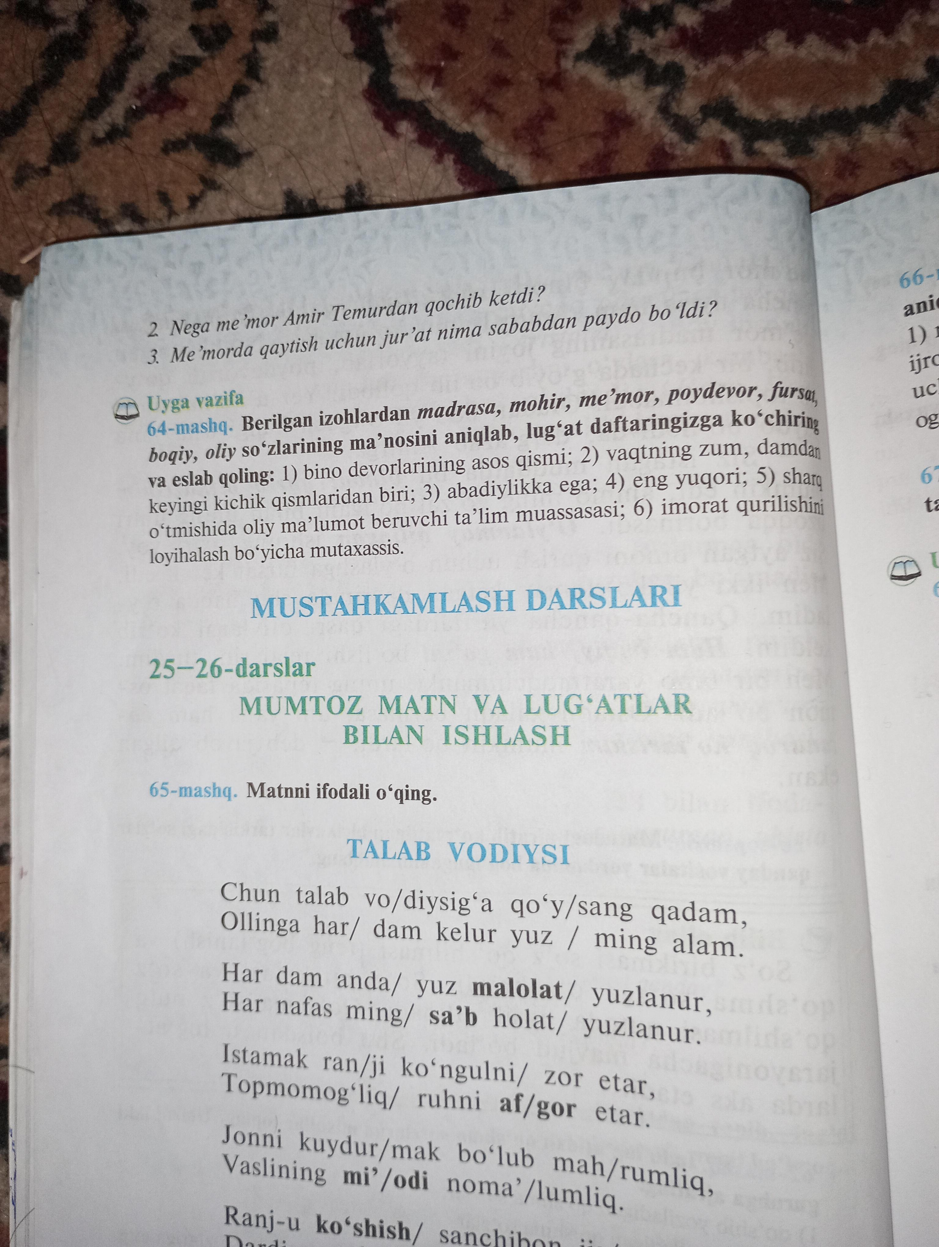 poydevor-birinchisi,fursat- ikkinchisi,boqiy-uchinchisi,oliy-to'rtinchisi,madrasa-beshinchisi,me'mor-oltinchisi