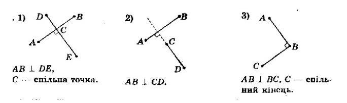 накресліть два перпендикулярних відрізки так, щоб вони: 1) перетиналися та не мали спільного кінця 2) не мали спільних точок 3) мали спільний кінець