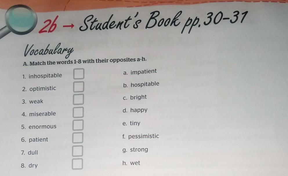 A. Match the words 1-8 with their opposites a-h.