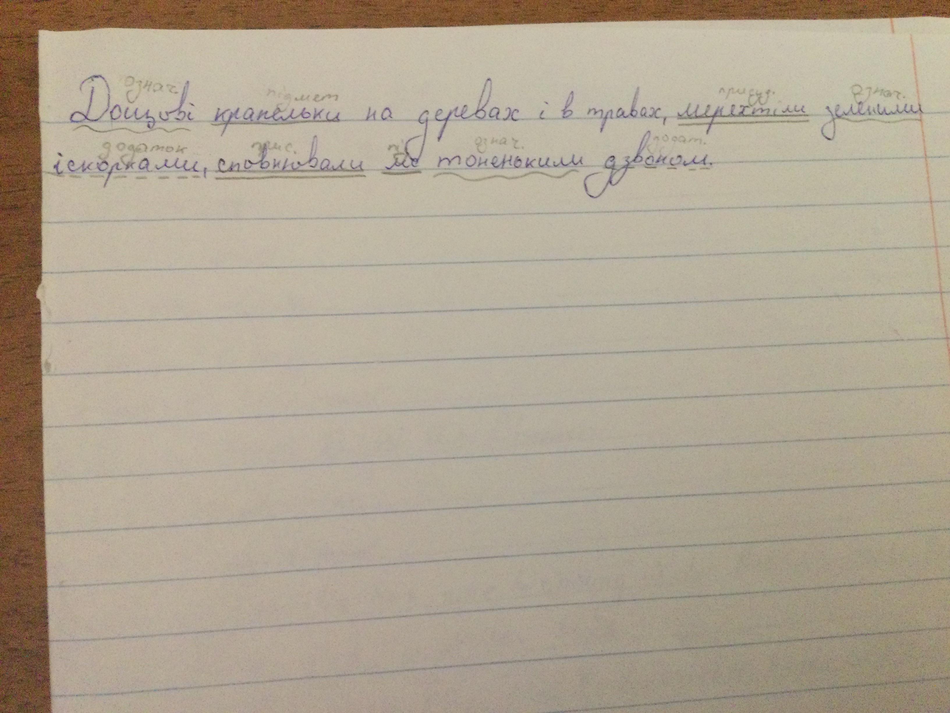 Дощові- прикметник, крапельки- іменник, на - прийменник, деревах - іменник, і -сполучник, в- прийменник, травах - прислівник, мерехтіли- дієслово, зеленими- прикметник, іскорками- іменник, сповнювали- дієслово, ліс - іменник, тоненьким-прикметник, дзвоном-іменник