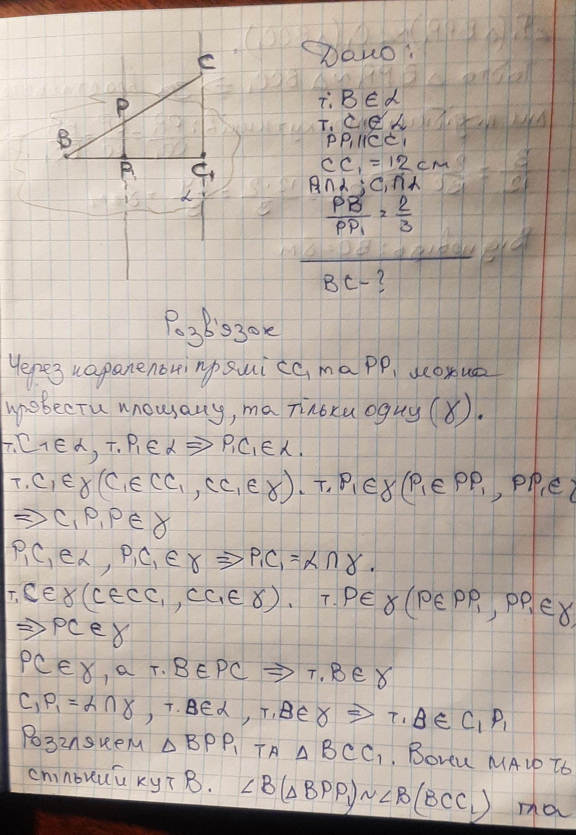 Кінець В відрізка ВС належить площині; через С і точку Р