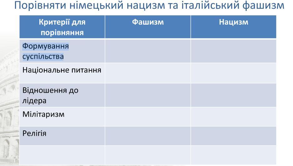 Мілітаризм:Фашизм: Фашистська Італія мала імперські амбіції, але не досягла такого мілітаризованого рівня, як Німеччина.
