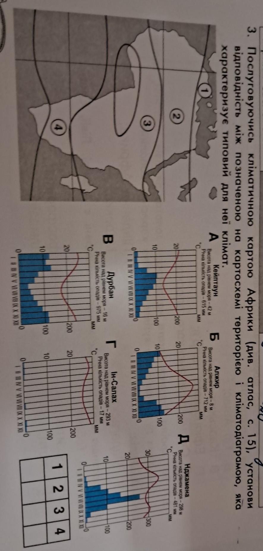3. Послуговуючись кліматичною картою Африки (див. атлас, атлас, с. 15), установи відповідність між позначеною на картосхемі територією і кліматодіаграмою, яка характеризує типовий для неï клімат. A 2 3 4 Кейптаун Висота над рівнем моря - 42 м Річка калькість опада - 615 мм 'С. NM В 20 10 'C 20 XX X X X 10 Дурбан Висота над рівнем моря - 16 м Ркальсть опала - 975 мм MM 200 X X X X 100 200 100 10 Б 'C 20 10 Г 0 'С Алжир Висота кад рівнем моря - 8 м Ручка кулясть опада - 712 мм MM 20 10 200 Д Ін-Салах Висота над рiвнем моря - 293 м Р на кількість опада - 17 мм 100 10 TINYMUVIA X XIX NVXXXX MMI 200 100 Нджамена Висота кам моря - 298 Рна кількість о431 °C. 30 20 10 1 X X X X MM 300 200 100 2 3 4