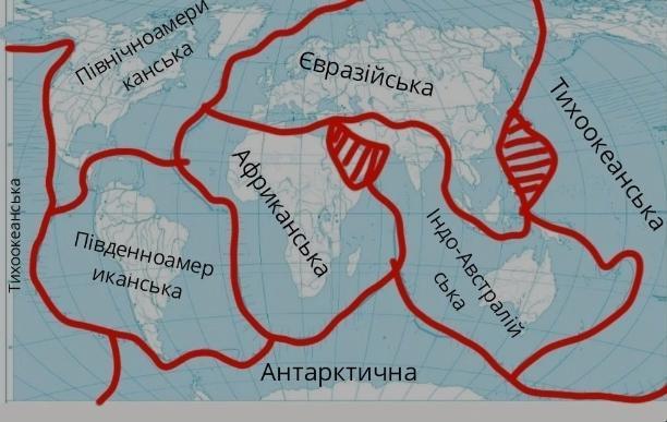 1. Використавши карти шкільного атласу, підпиши позначені на малюнку сім найбільших літосферних плит Землі. Стрілочками покажи напрям руху літосферних плит (розходяться, стикаються).