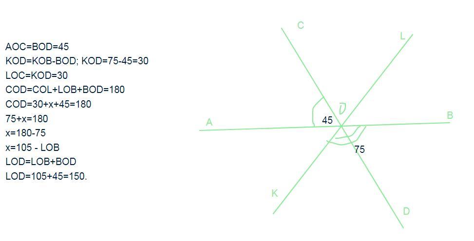 пажалуста 4. Прямі АВ, CD i KL перетинаються в точці о На малюнку angle AOC = 45 deg ; angle KOB = 75 deg Знай діть градусну міру кута LOD. D
