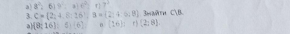 3. C= (2;4.8:16), a){s: 16}; 3) (6) r}7) 3 = (214 5:8). Знайти C\B. В (16}; г) (2:8).