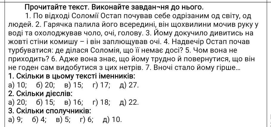 ПОЖАЛУЙСТА Прочитайте текст. Виконайте завдан¬ня до нього. 1. По відході Соломії Остап почував себе одрізаним од світу, од людей. 2. Гарячка палила його всередині, він щохвилини мочив руку у воді та охолоджував чоло, очі, голову. 3. Йому докучило дивитись на жовті стіни комишу - і він заплющував очі. 4. Надвечір Остап почав турбуватися: де ділася Соломія, що її немає досі? 5. Чом вона не приходить? 6. Адже вона знає, що йому трудно й повернутися, що він не годен сам видобутися з цих нетрів. 7. Вночі стало йому гірше...