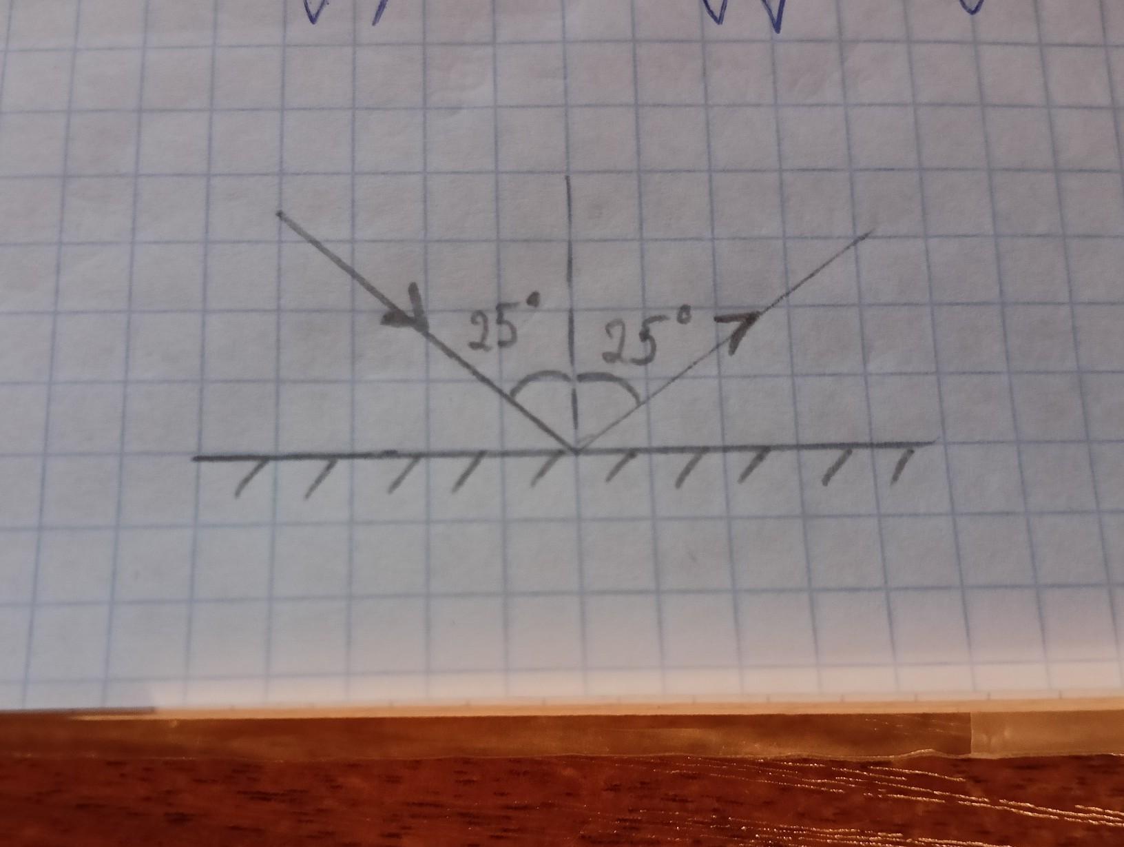 Отже, якщо кут відбиття від поверхні дзеркала дорівнює 25 градусів, то кут падіння також дорівнює 25 градусів. Немає потреби робити малюнок, оскільки кут падіння і кут відбиття однакові і рівні 25 градусам.