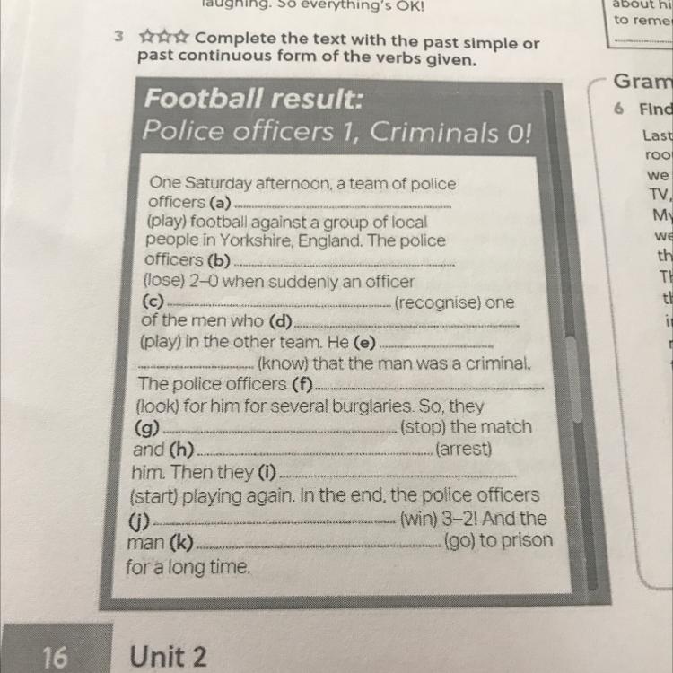 The police officers (f) had been looking for him for several burglaries. So, they (g) stopped the match and (h) arrested him. Then they (i) started playing again. In the end, the police officers (j) won 3-2! And the man (k) went to prison.