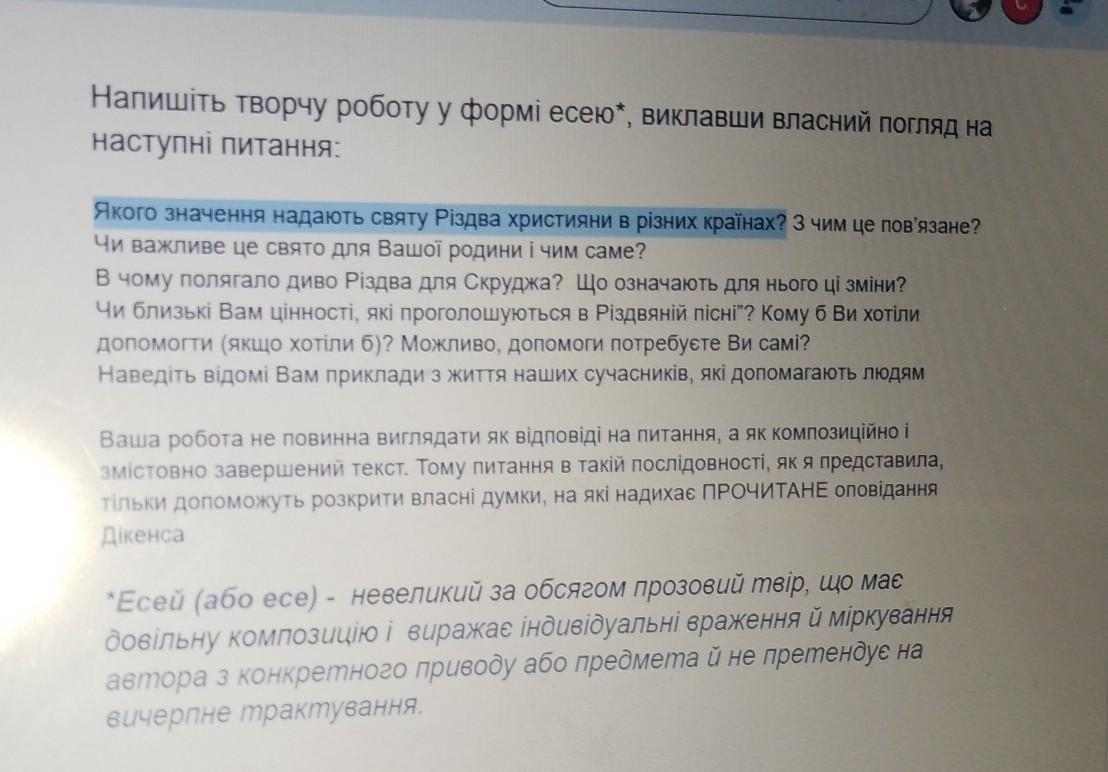 Напишіть творчу роботу у формі есею*, виклавши власний погляд на наступні питання: Якого значення надають святу Рiздва християни в різних країнах? З чим це пов'язане? Чи важливе це свято для Вашої родини і чим саме? В чому полягало диво Рiздва для Скруджа? Що означають для нього цi змiни? Чи близькі Вам цінності, які проголошуються в Рiздвяній пісні"? Кому б Ви хотіли допомогти (якщо хотіли б)? Можливо, допомоги потребуете Ви самі? Наведіть відомі Вам приклади з життя наших сучасників, які допомагають людям Ваша робота не повинна виглядати як відповіді на питання, а як композиційно і змістовно завершений текст. Тому питання в такій послідовності, як я представила, тільки допоможуть розкрити власні думки, на які надихає ПРОЧИТАНЕ оповідання Дікенса *Есей (або есе) - невеликий за обсягом прозовий твір, що має довільну композицію і виражає індивідуальні враження й міркування автора з конкретного приводу або предмета й не претендує на вичерпне трактування.