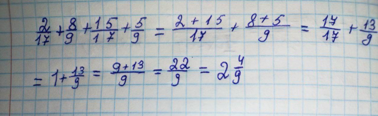 2/17 + 8/9 + 15/17 + 5/9 = 2+15/17 + 8+5/9 = 17/17 + 13/9 = 9+13/9 = 22/9 = 2 4/9