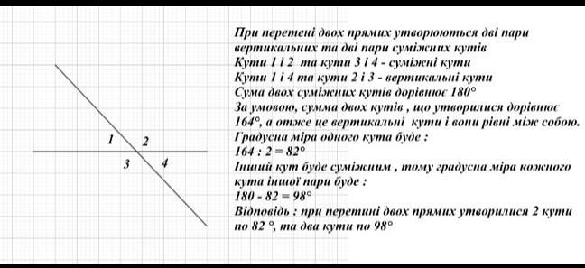 Сума 2 кутів що утворилися в наслидок перетен 2 прямих, становить 164° знати уси кути що утворились у результаті перетен цих прямих