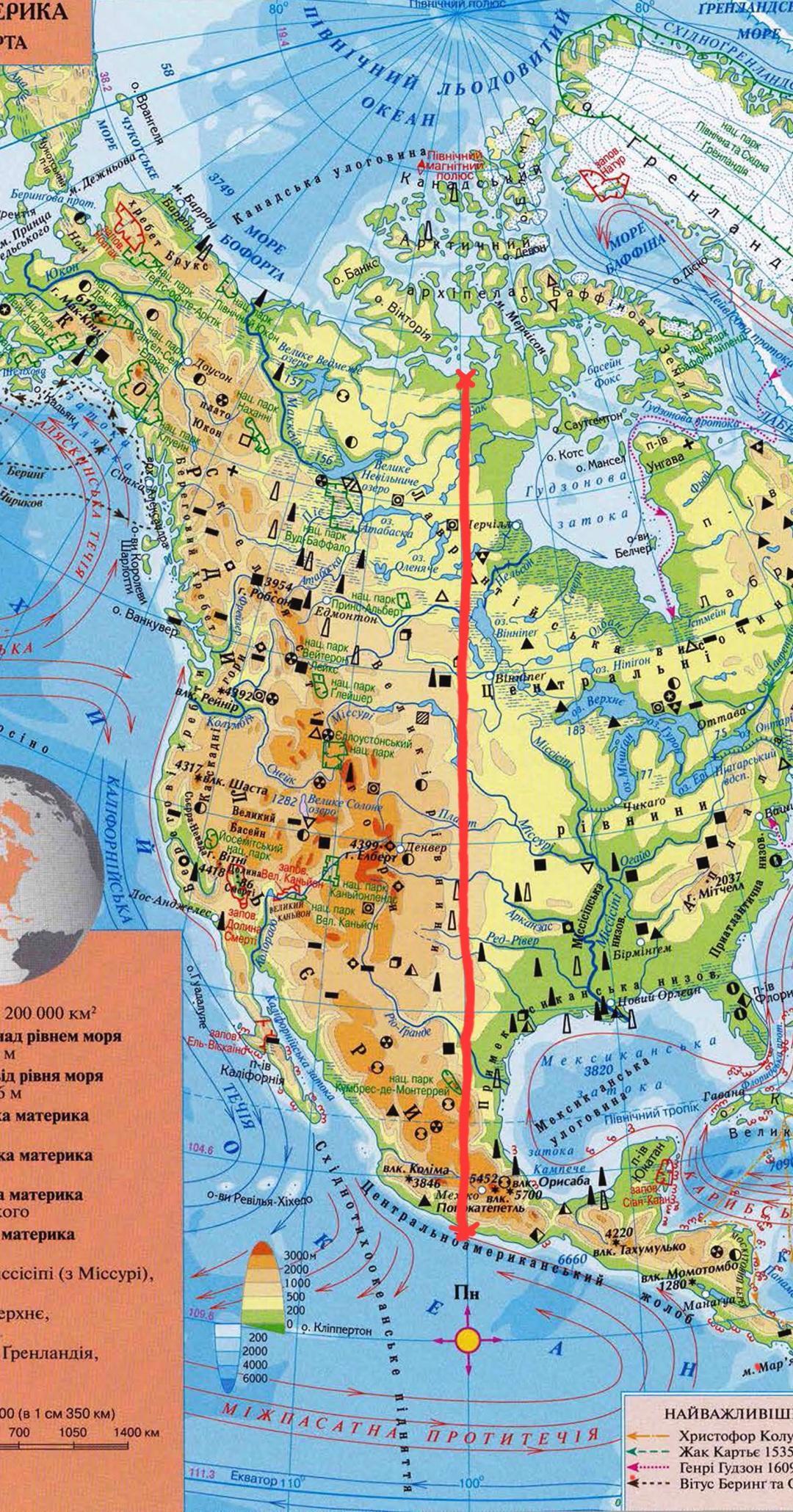 порахувати протяжність північної Америки за мередіаном 100° зх.д.