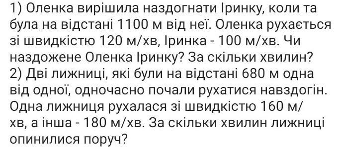 1)Оленка вирішила наздогнати Іринку, коли та була на відстані 1100м від неї,Оленка рухається зі швидкістю 120м/хв Іринка 100м/хв чи наздожене Оленка Іринку? За скільки хвилин?