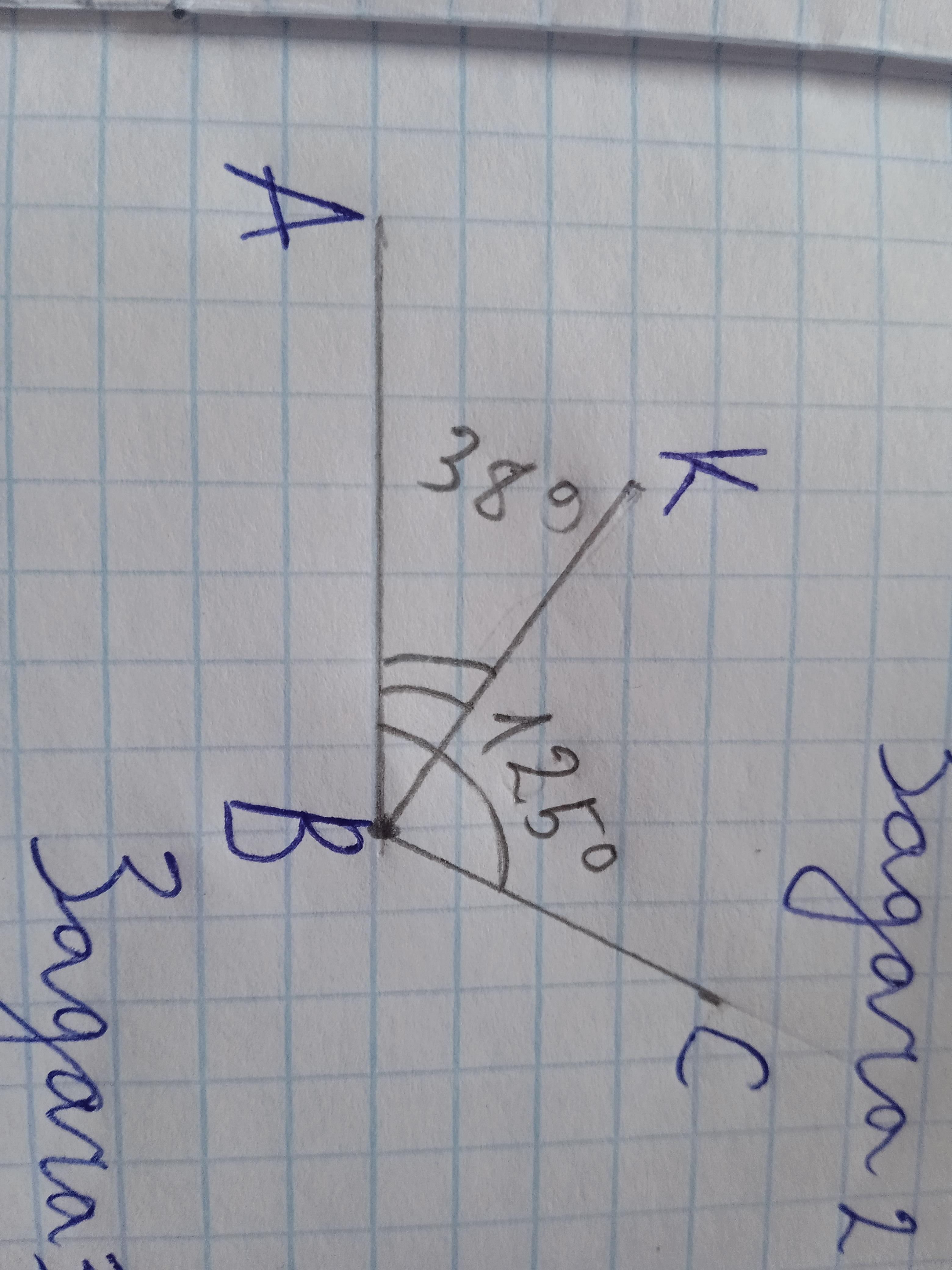 2.Кут АВС = 125 °, промінь ВК поділяє його на два кути: кут АВК та кут КВС, знайти кут КВС, якщо кут АВК= 38 °. Виконати відповідний малюнок.