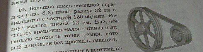 Большой шкив ременной передачи имеет радиус 32см и вращается с частотой 135 об/мин. Радиус малого шкива 12см. Найдите частоту вращения малого шкива и линейную скорость точек ремня, который движется без проскальзывания