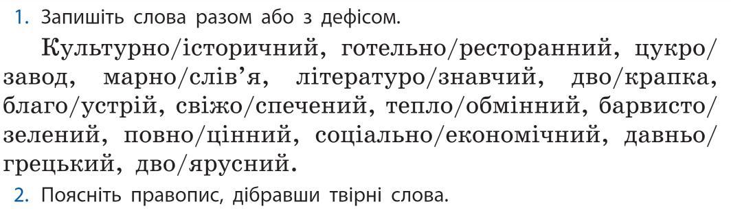 культурно-історичний, готельно-ресторанний, цукрозавод, марнослів'я, літературнознавчий, двокрапка, благоустрій, свіжоспечений, теплообмінний, барвисто-зелений, повноцінний, соціально-економічний, давньогрецький, двоярусний.