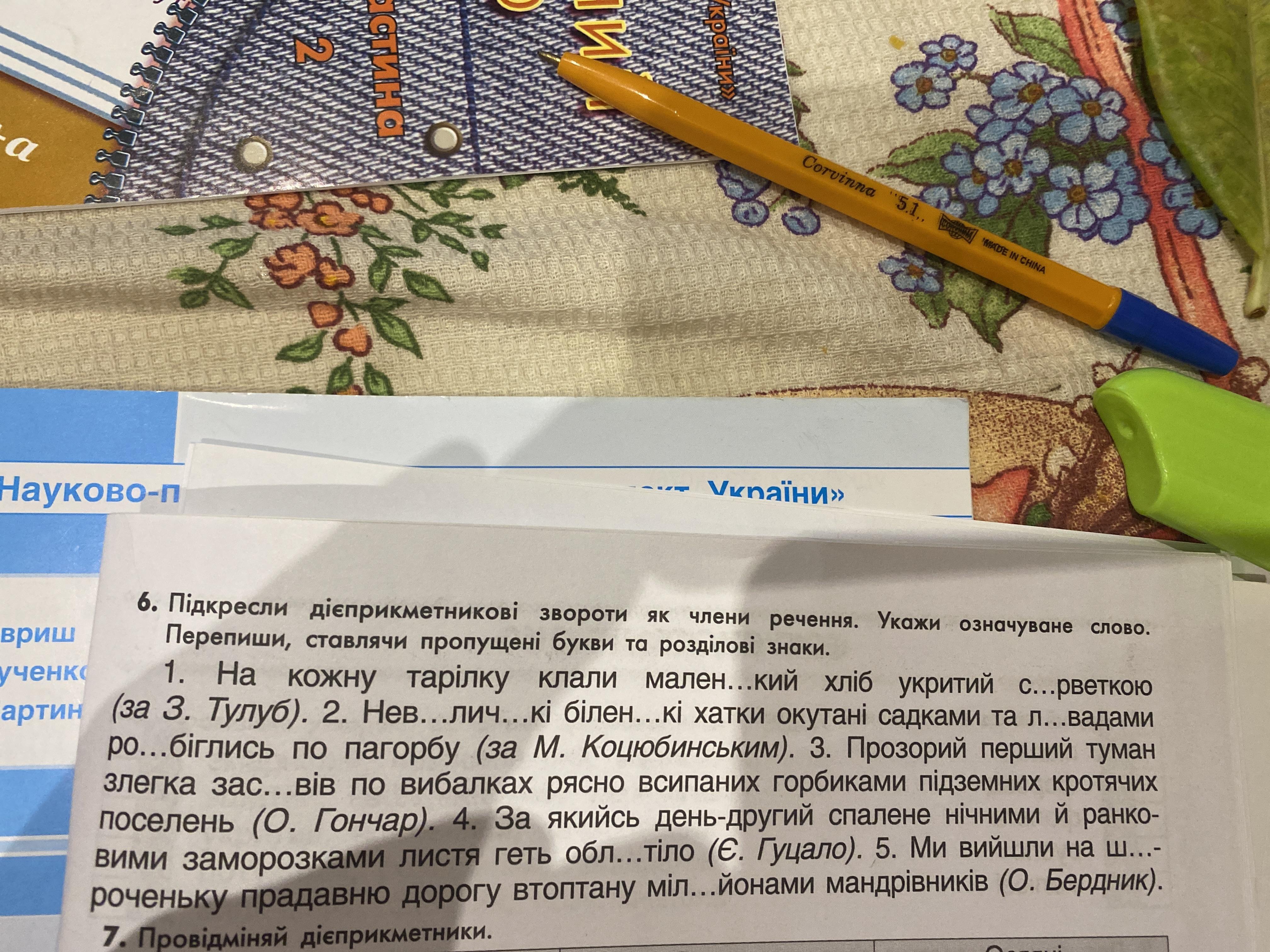6. Підкресли дієприкметникові звороти як члени речення. Укажи означуване слово. Перепиши, ставлячи пропущені букви та розділові знаки. 1. На кожну тарілку клали мален...кий хліб укритий с...рветкою (за 3. Тулуб). 2. Нев...лич..кі білен.кі хатки окутані садками та л..вадами ро... біглись по пагорбу (за М. Коцюбинським). 3. Прозорий перший туман злегка зас...вів по вибалках рясно всипаних горбиками підземних кротячих поселень (О. Гончар). 4. За якийсь день-другий спалене нічними й ранковими заморозками листя геть обл...тіло (Є. Гуцало). 5. Ми вийшли на ш...-роченьку прадавню дорогу втоптану міл...йонами мандрівників (О. Бердник).