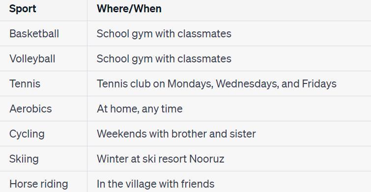 2. a) Listen or read. What sports does Aigul play? Why do I like sports? I play different sports. I play basketball and volleyball with my classmates in the school gym. I don't do athletics because I don't like it. I play tennis at the tennis club on Mondays, Wednesdays, and Fridays. My favourite tennis players are Serena Williams and Venus Williams. I really like them. I also quite like Rafael Nadal. I do aerobics to music at home. It's nice because I can do it any time I want. I don't do karate because I hate it. I go cycling at weekends with my brother and sister. In winter, I go skiing with my parents at the ski resort Nooruz. In summer, I visit my grandparents who live in Naryn. I go horse riding with my friends in the village. I play a lot of sports. Sports are important in my life. I'm healthy, so I'm happy. b) Copy the table into your notebook. Read the text again. Complete the table with the names of sports. play basketball do go пж ответте