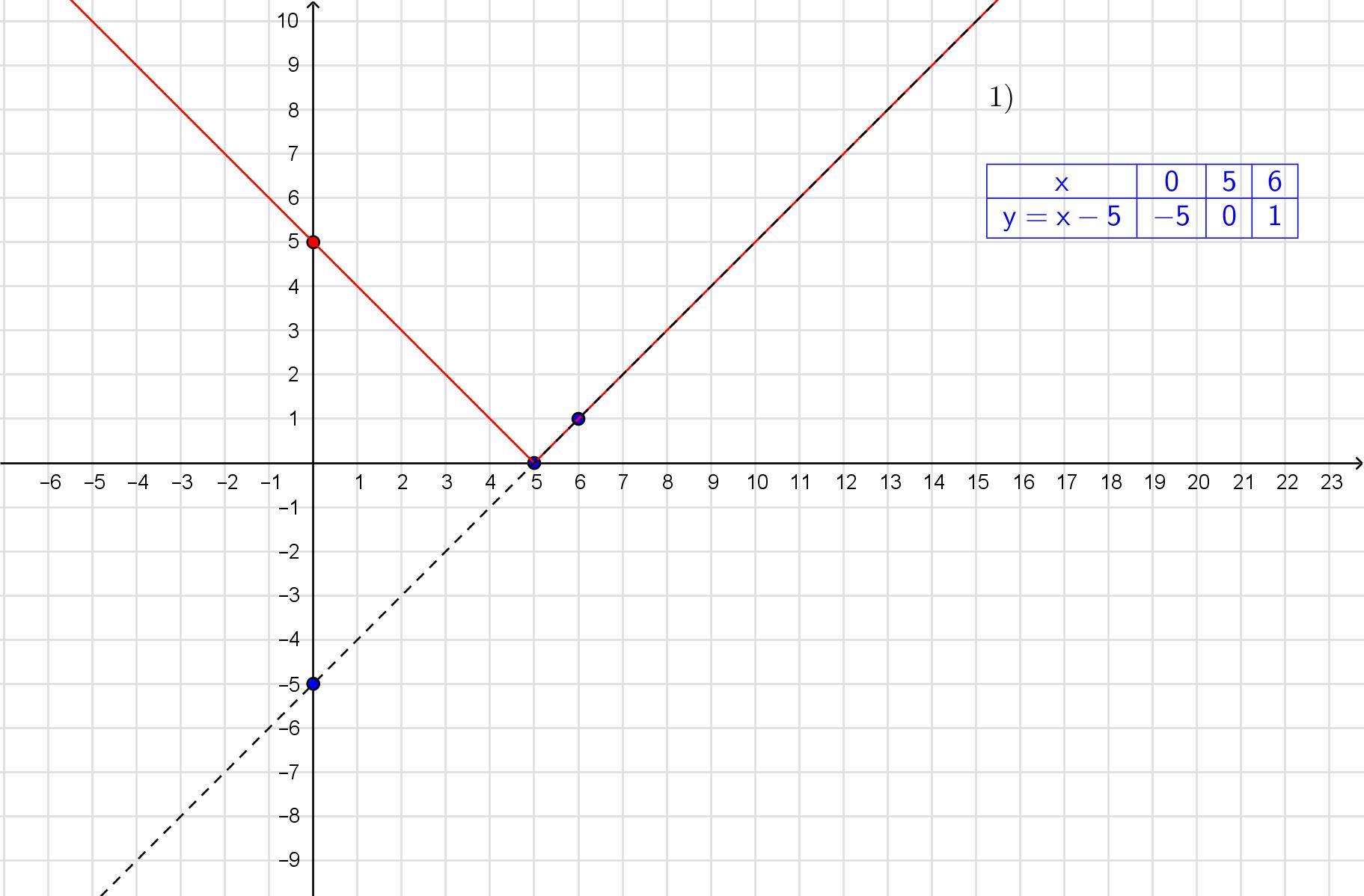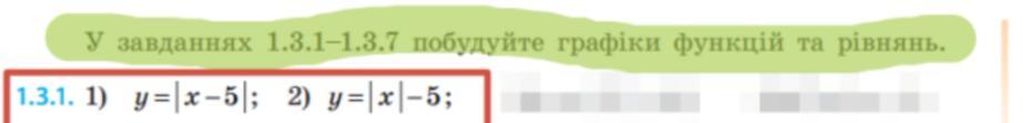 Графік функції y=|x-5| можна отримати із графіка функції у = x-5 відобразивши частину, що знаходиться нижче осі абсцис, симетрично відносно цієї осі.