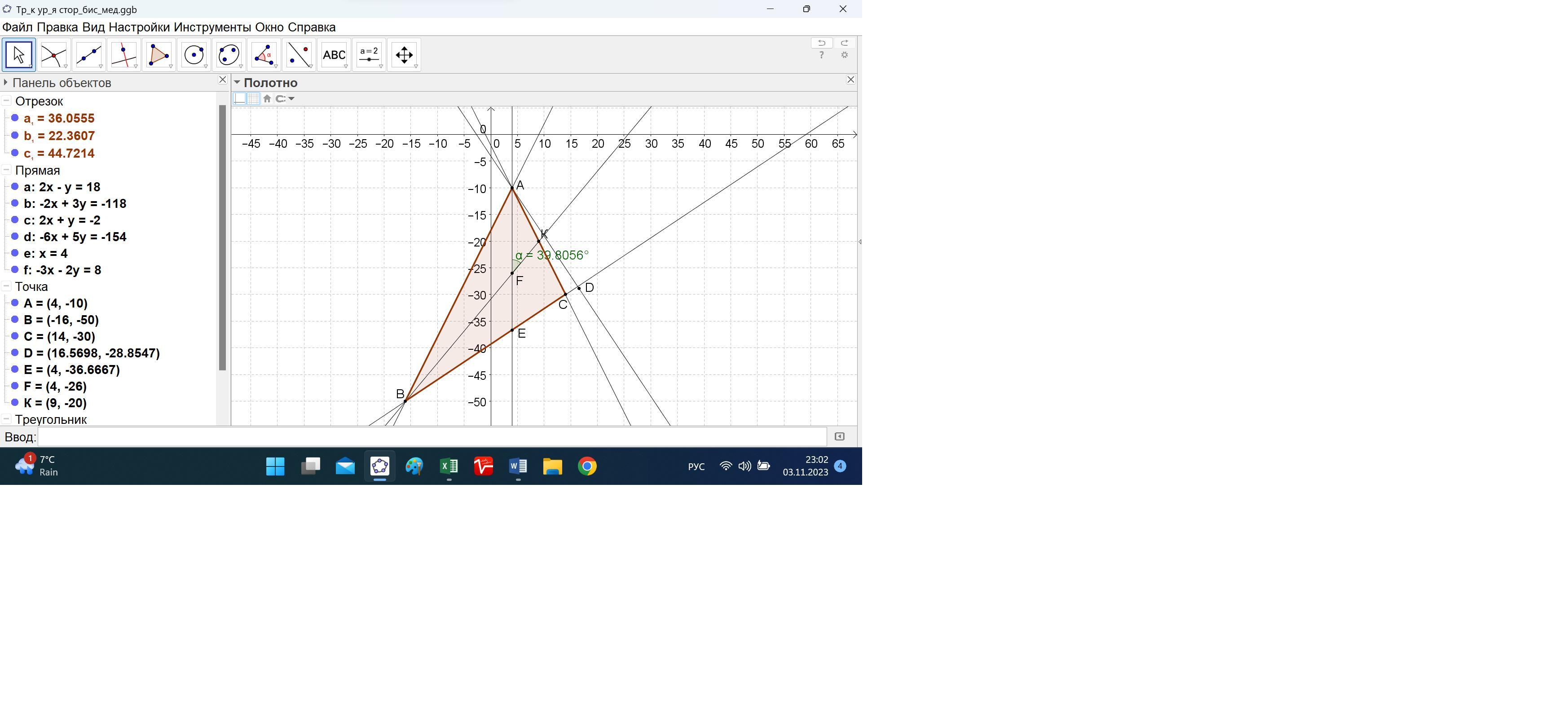 Так как прямая х = 4 это вертикальная прямая с углом 90 градусов, то искомый угол между биссектрисой АЕ и медианой ВК равен 90 – 50,19443 = 39,80557 градуса.